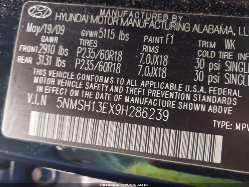 2009 HYUNDAI SANTA FE LIMITED VIN: 5NMSH13EX9H286239 LOT: 43493756