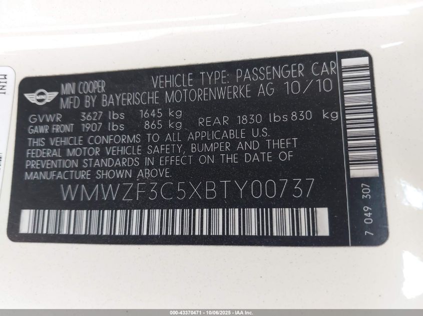 2011 MINI COOPER CLUBMAN VIN: WMWZF3C5XBTY00737 LOT: 43370471