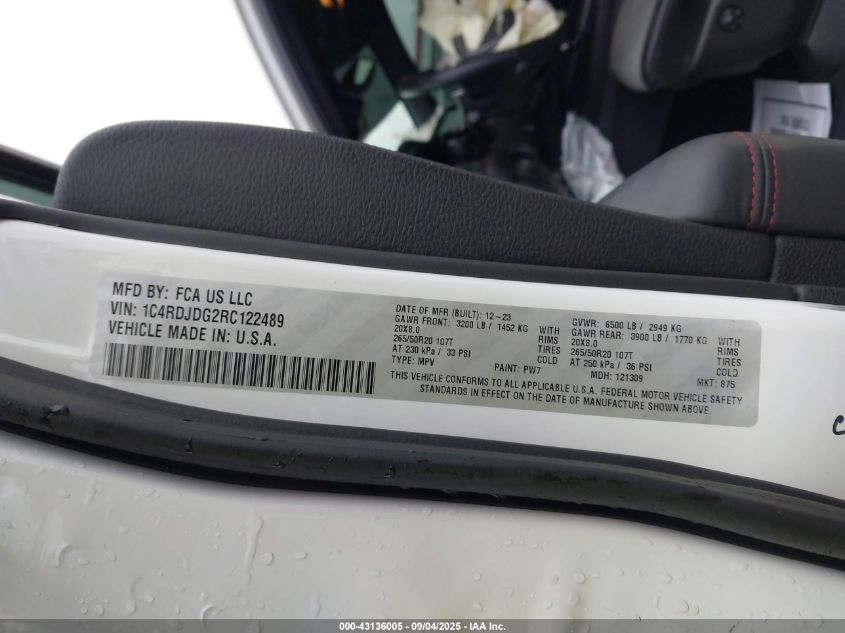 2024 DODGE DURANGO GT VIN: 1C4RDJDG2RC122489 LOT: 43136005