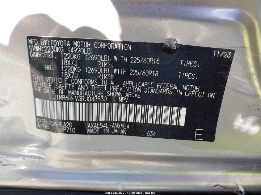 2024 TOYOTA RAV4 HYBRID XLE PREMIUM VIN: JTMB6RFV3RJ043530 LOT: 43480872