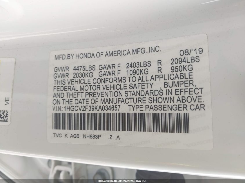2019 HONDA ACCORD SPORT 2.0T VIN: 1HGCV2F39KA034657 LOT: 43300418