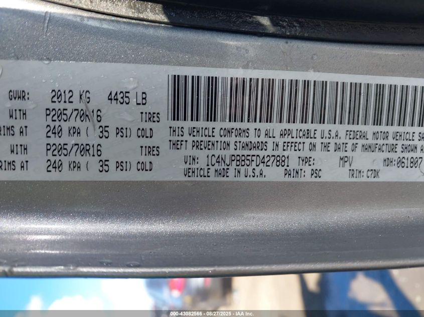 2015 JEEP PATRIOT SPORT VIN: 1C4NJPBB5FD427881 LOT: 43082566