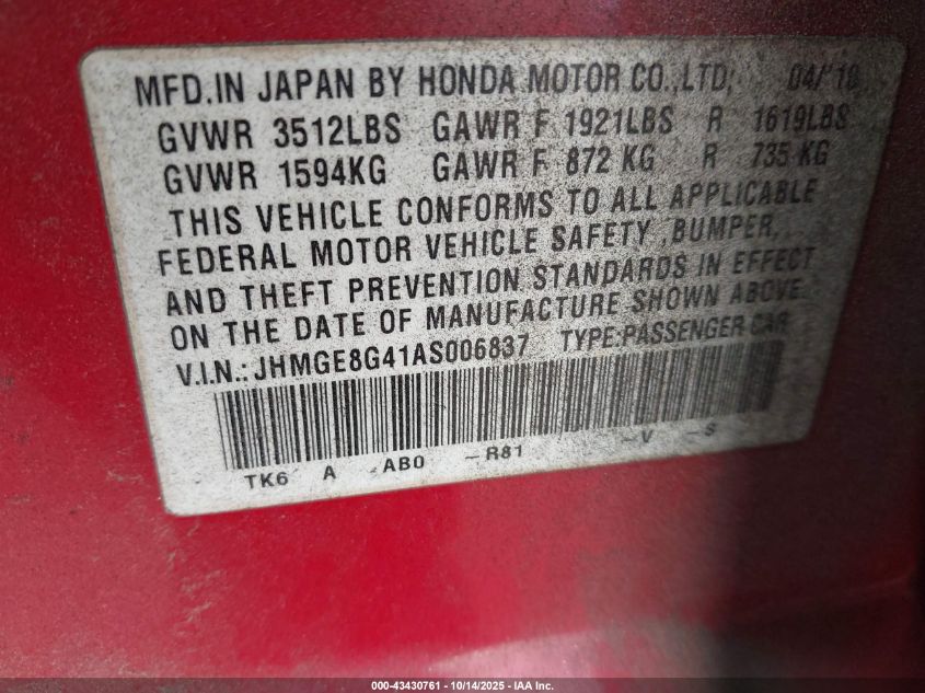 2010 HONDA FIT SPORT VIN: JHMGE8G41AS006837 LOT: 43430761