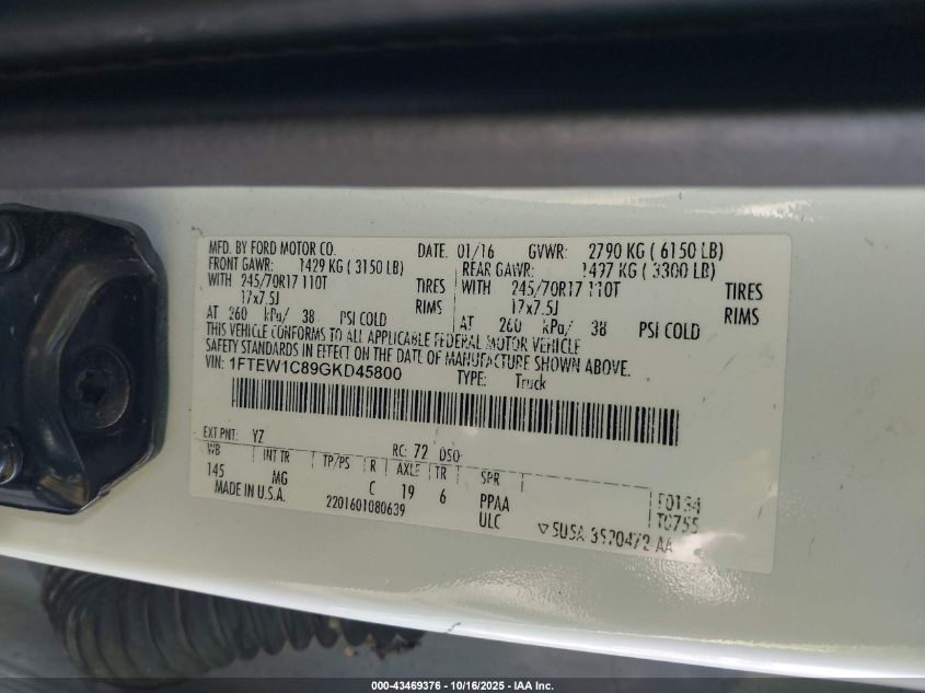 2016 FORD F-150 XLT VIN: 1FTEW1C89GKD45800 LOT: 43469376