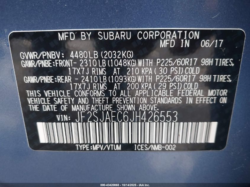 2018 SUBARU FORESTER 2.5I PREMIUM VIN: JF2SJAEC6JH426553 LOT: 43420868