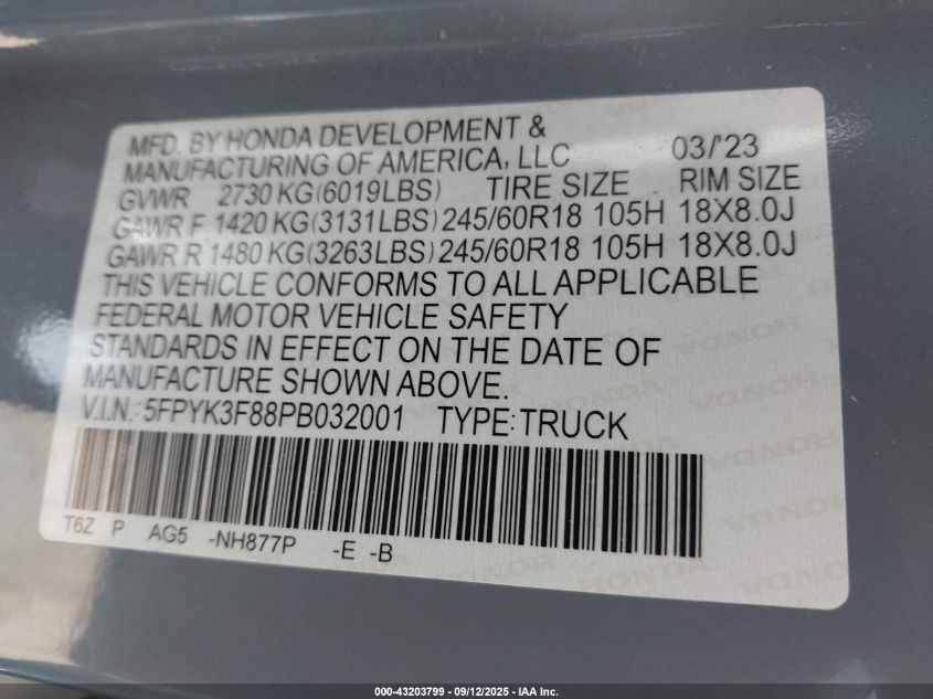 2023 HONDA RIDGELINE BLACK EDITION VIN: 5FPYK3F88PB032001 LOT: 43203799