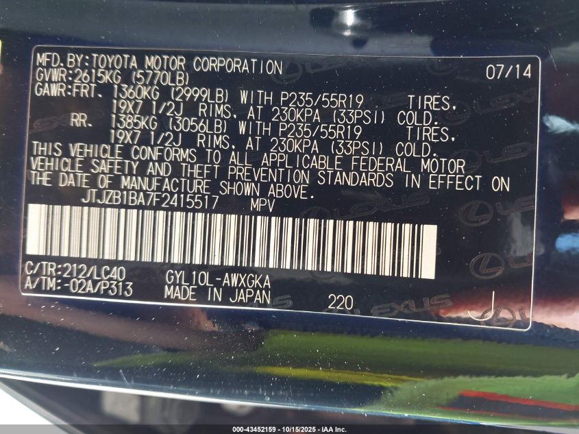2015 LEXUS RX 450H VIN: JTJZB1BA7F2415517 LOT: 43452159