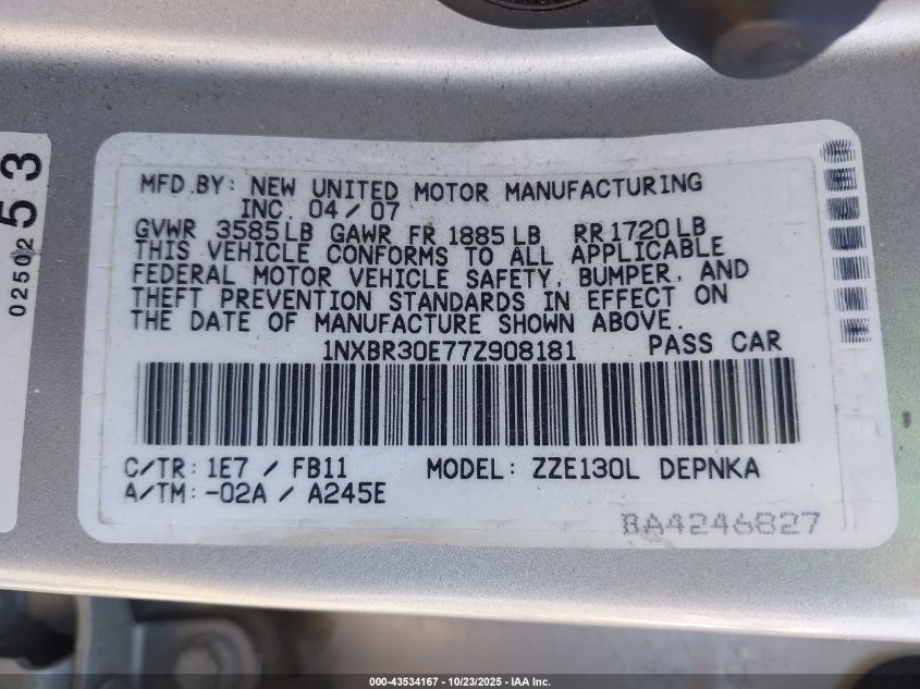 2007 TOYOTA COROLLA LE VIN: 1NXBR30E77Z908181 LOT: 43534167