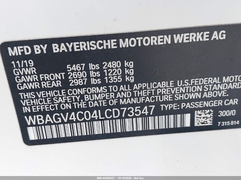 2020 BMW 840I GRAN COUPE XDRIVE VIN: WBAGV4C04LCD73547 LOT: 43400427