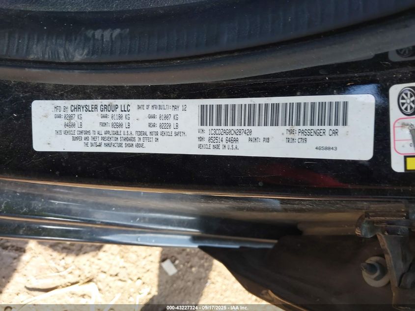 2012 DODGE AVENGER SE V6 VIN: 1C3CDZAG0CN287420 LOT: 43227324