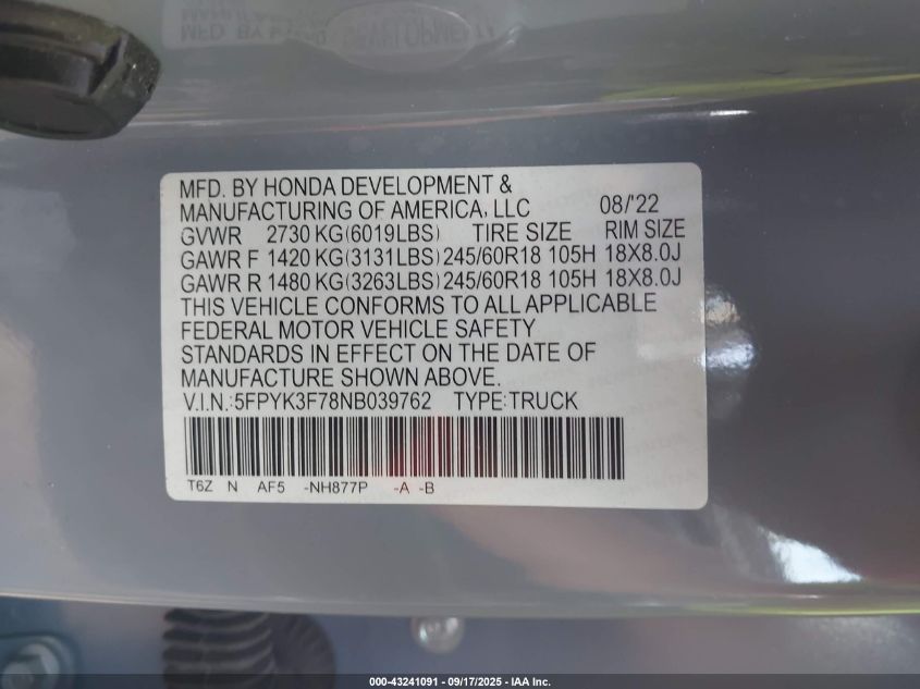2022 HONDA RIDGELINE RTL VIN: 5FPYK3F78NB039762 LOT: 43241091