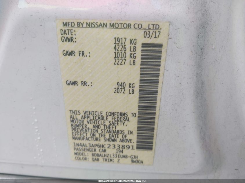 2017 NISSAN ALTIMA 2.5 SR VIN: 1N4AL3AP6HC233891 LOT: 42986897