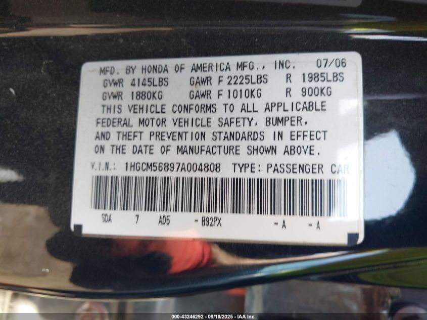 2007 HONDA ACCORD 2.4 EX VIN: 1HGCM56897A004808 LOT: 43246292
