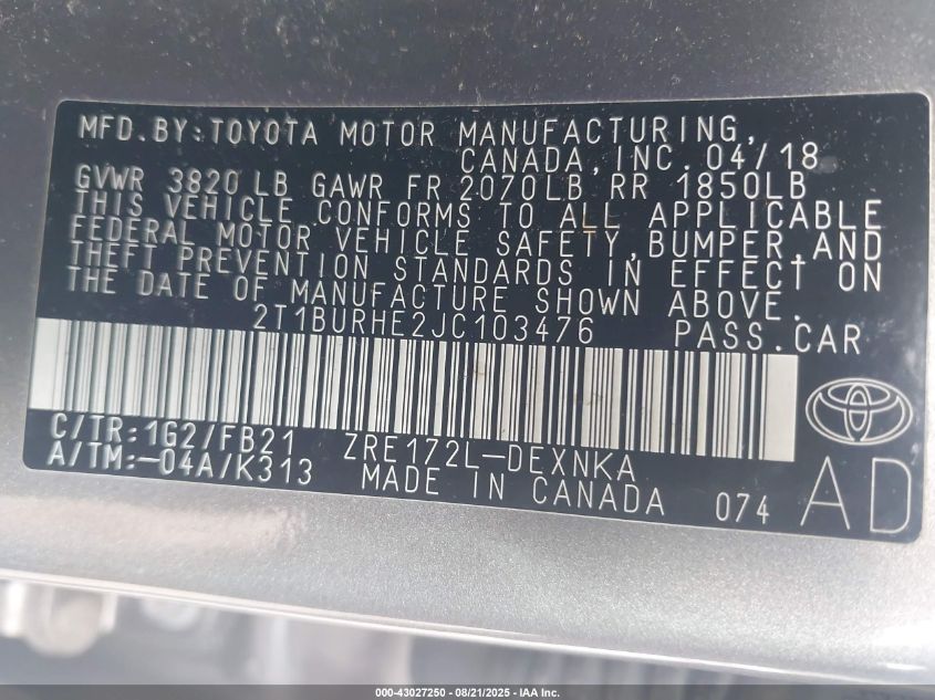 2018 TOYOTA COROLLA LE VIN: 2T1BURHE2JC103476 LOT: 43027250