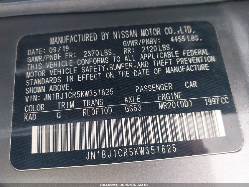 2019 NISSAN ROGUE SPORT SV VIN: JN1BJ1CR5KW351625 LOT: 43292197