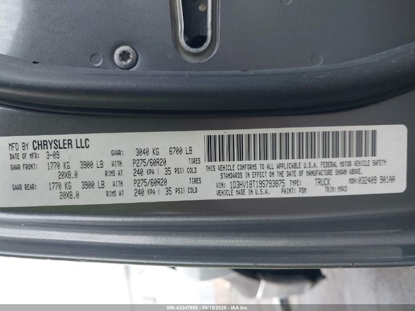 2009 DODGE RAM 1500 SLT/SPORT/TRX VIN: 1D3HV18T19S793875 LOT: 43247958