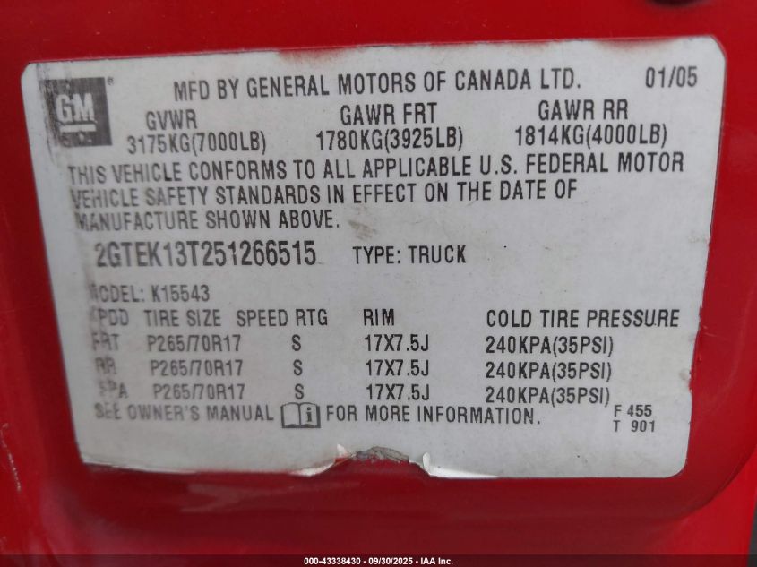 2005 GMC SIERRA 1500 SLE VIN: 2GTEK13T251266515 LOT: 43338430