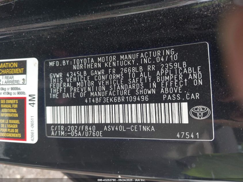 2011 TOYOTA CAMRY LE VIN: 4T4BF3EK6BR109496 LOT: 43253790