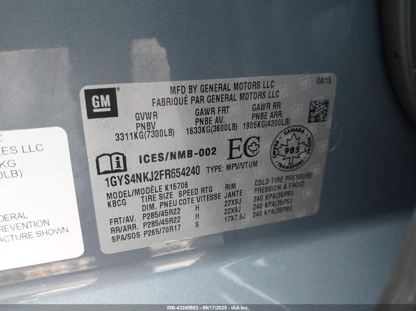 2015 CADILLAC ESCALADE PREMIUM VIN: 1GYS4NKJ2FR654240 LOT: 43240983