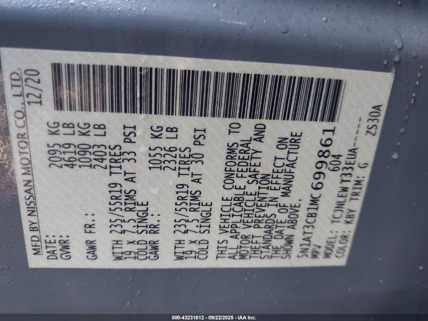 2021 NISSAN ROGUE SL INTELLIGENT AWD VIN: 5N1AT3CB1MC699861 LOT: 43231612