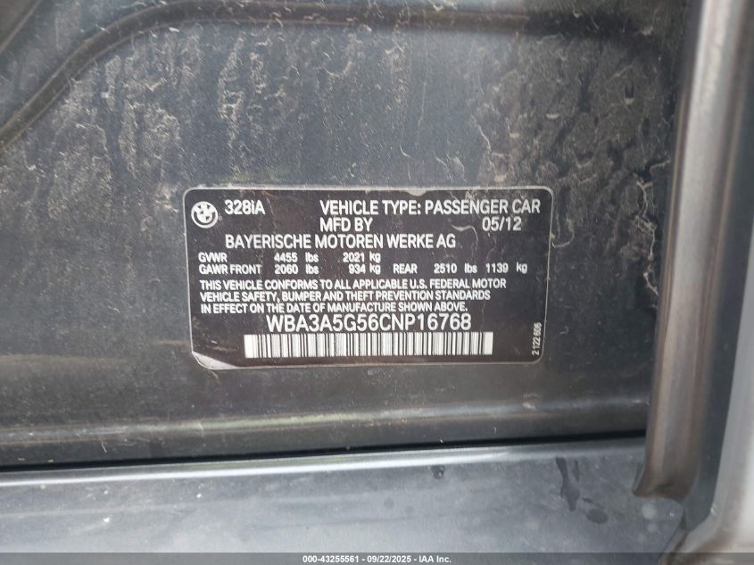 2012 BMW 328I VIN: WBA3A5G56CNP16768 LOT: 43255561