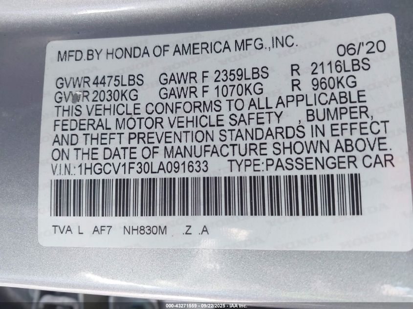 2020 HONDA ACCORD SPORT VIN: 1HGCV1F30LA091633 LOT: 43271559