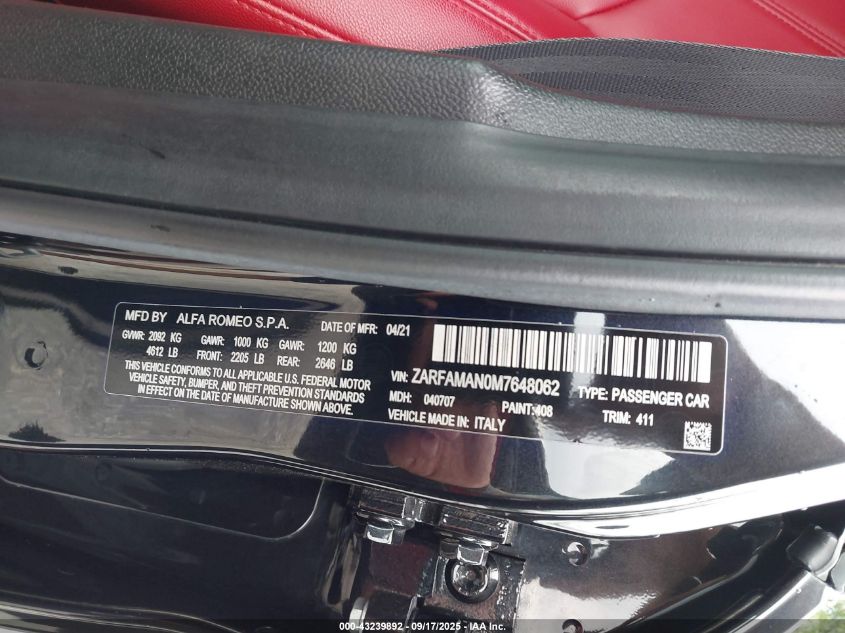 2021 ALFA ROMEO GIULIA RWD VIN: ZARFAMAN0M7648062 LOT: 43239892