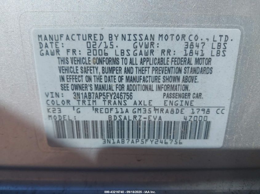 2015 NISSAN SENTRA SR VIN: 3N1AB7AP5FY246756 LOT: 43216740
