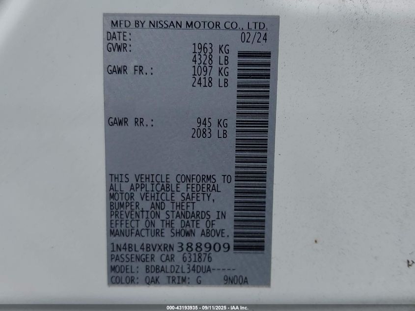 2024 NISSAN ALTIMA S FWD VIN: 1N4BL4BVXRN388909 LOT: 43193935