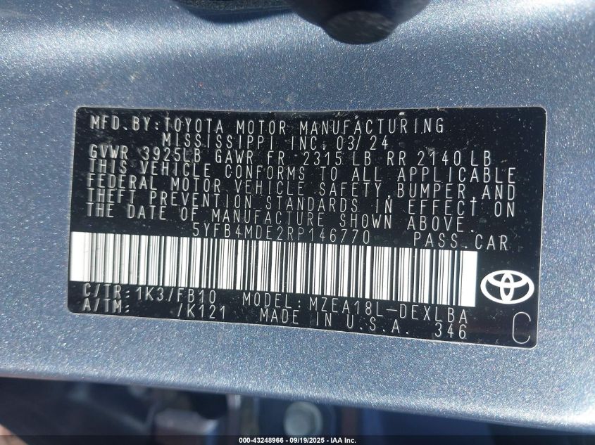 2024 TOYOTA COROLLA LE VIN: 5YFB4MDE2RP146770 LOT: 43248966