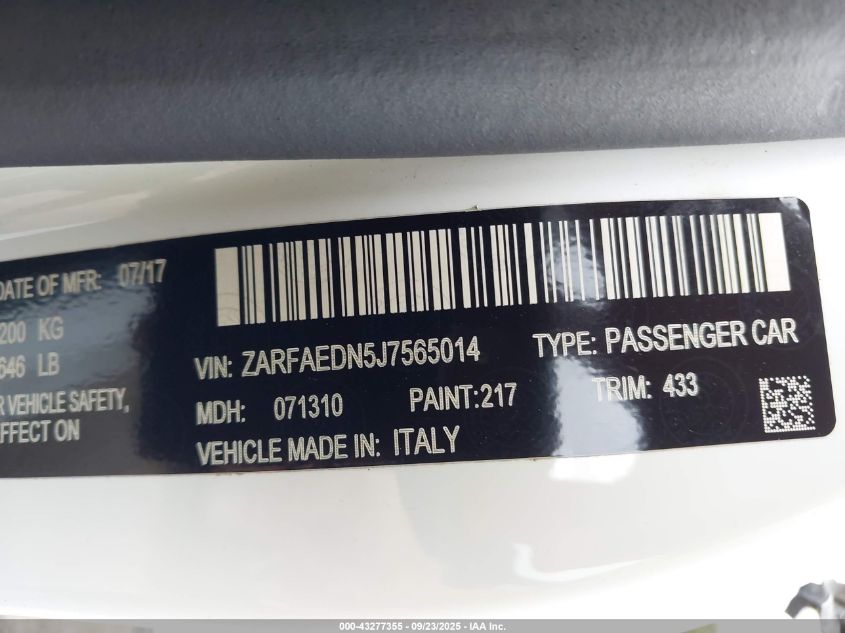 2018 ALFA ROMEO GIULIA AWD VIN: ZARFAEDN5J7565014 LOT: 43277355