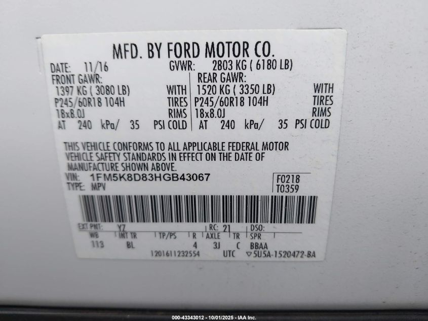 2017 FORD EXPLORER XLT VIN: 1FM5K8D83HGB43067 LOT: 43343012
