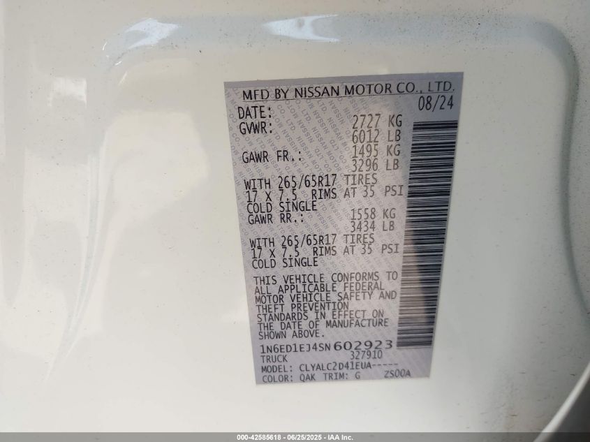 2025 NISSAN FRONTIER SV 4X2 VIN: 1N6ED1EJ4SN602923 LOT: 42585618