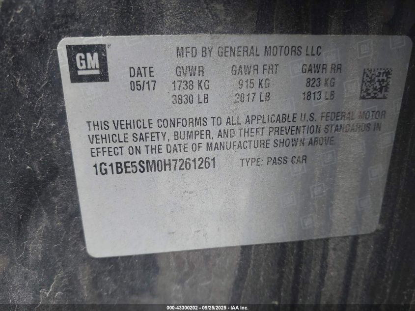 2017 CHEVROLET CRUZE LT AUTO VIN: 1G1BE5SM0H7261261 LOT: 43300202