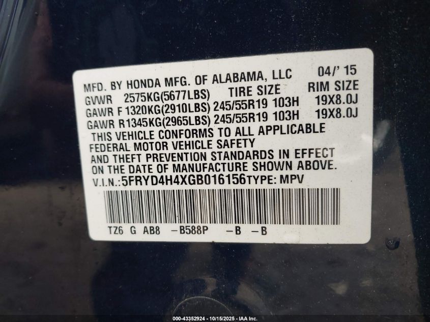 2016 ACURA MDX TECHNOLOGY ACURAWATCH PLUS PACKAGES/TECHNOLOGY PACKAGE VIN: 5FRYD4H4XGB016156 LOT: 43352924