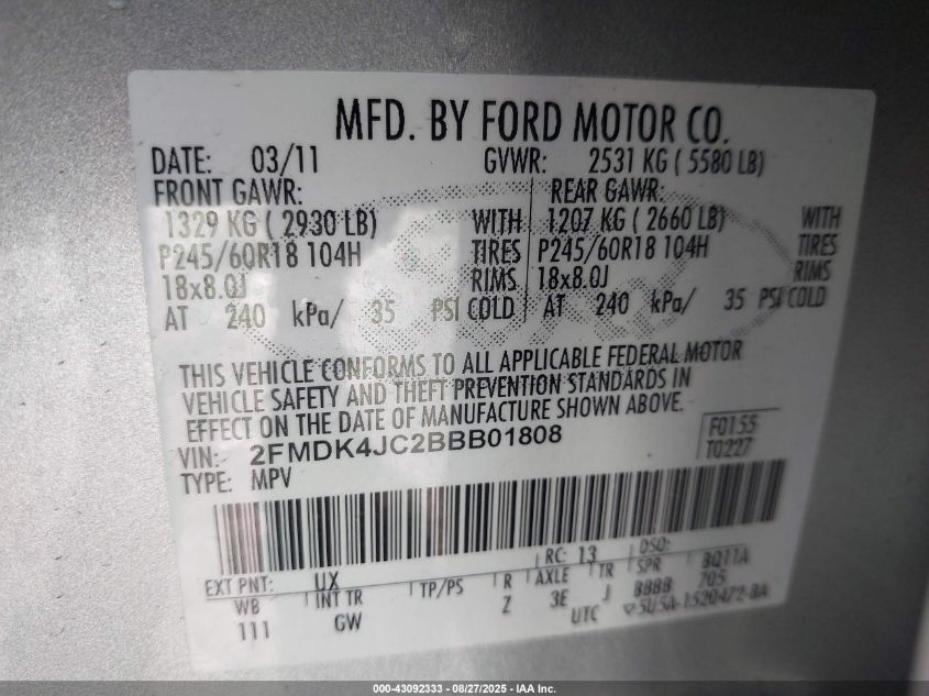 2011 FORD EDGE SEL VIN: 2FMDK4JC2BBB01808 LOT: 43092333