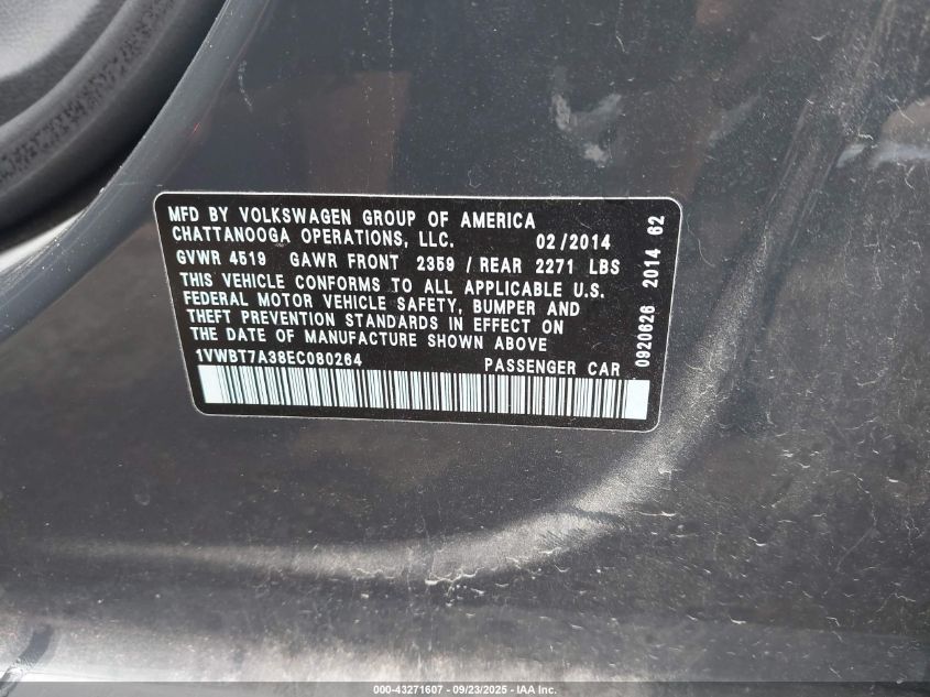 2014 VOLKSWAGEN PASSAT 1.8T SPORT VIN: 1VWBT7A38EC080264 LOT: 43271607