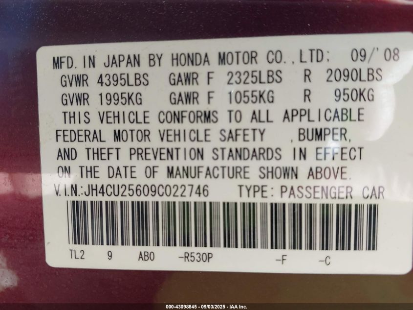 2009 ACURA TSX VIN: JH4CU25609C022746 LOT: 43098845