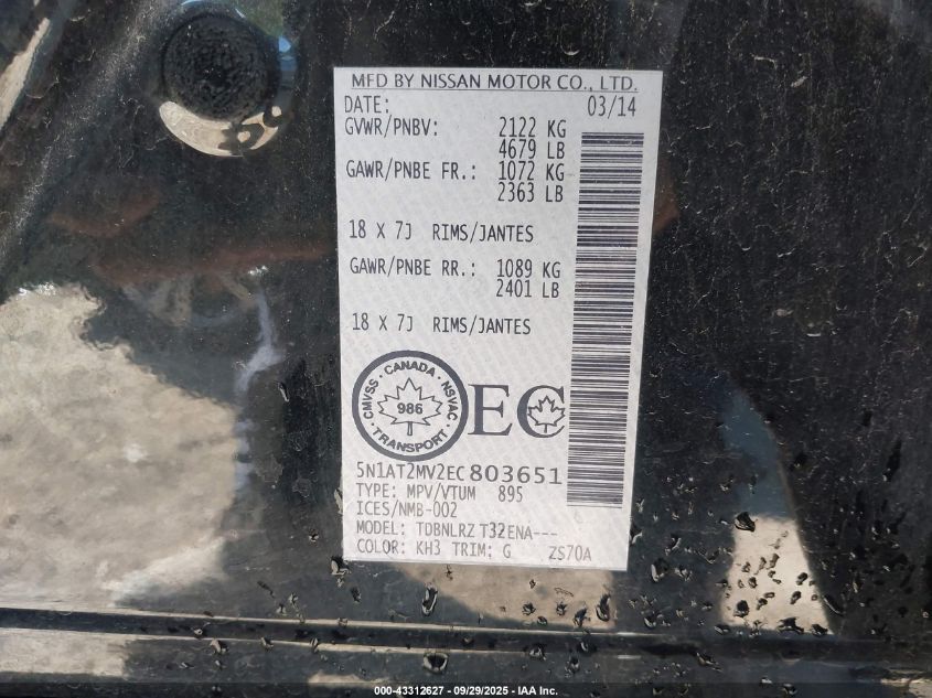 2014 NISSAN ROGUE S/SL/SV VIN: 5N1AT2MV2EC803651 LOT: 43312627