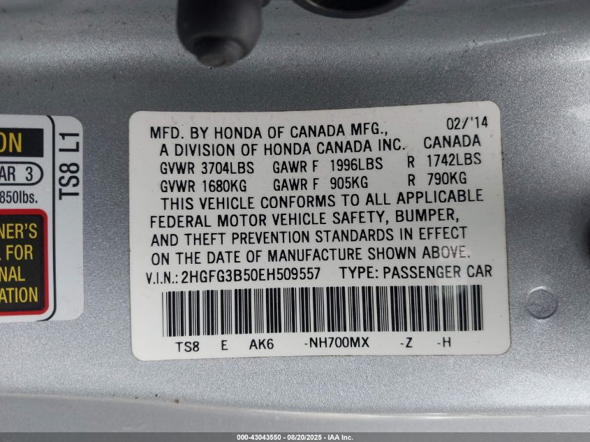 2014 HONDA CIVIC LX VIN: 2HGFG3B50EH509557 LOT: 43043550