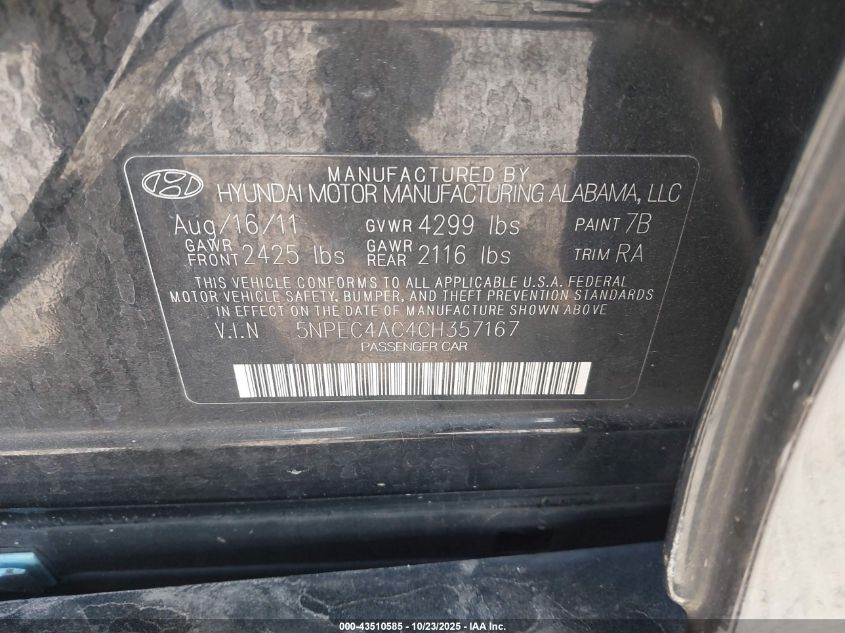 2012 HYUNDAI SONATA LIMITED VIN: 5NPEC4AC4CH357167 LOT: 43510585