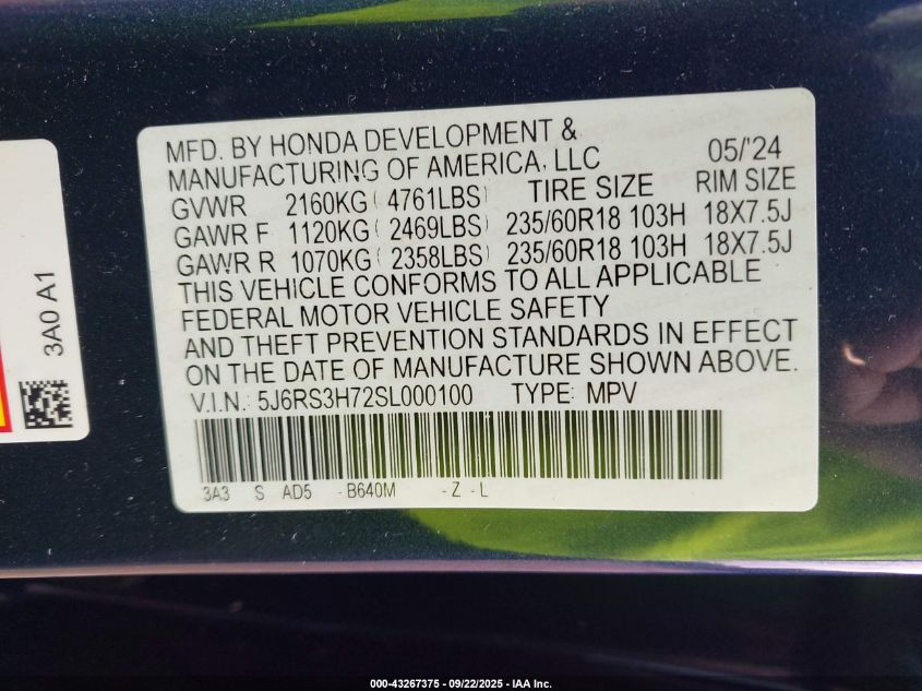 2025 HONDA CR-V EX-L 2WD VIN: 5J6RS3H72SL000100 LOT: 43267375