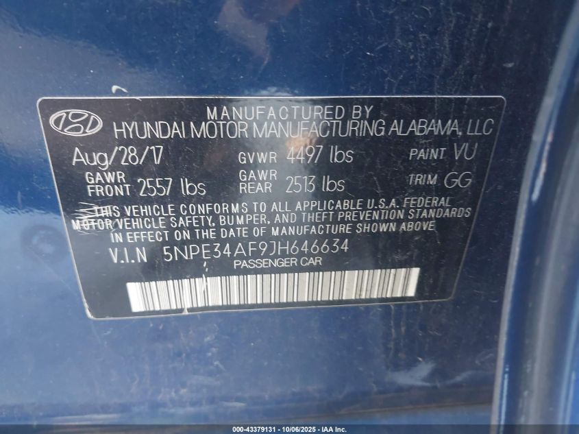 2018 HYUNDAI SONATA SEL VIN: 5NPE34AF9JH646634 LOT: 43379131
