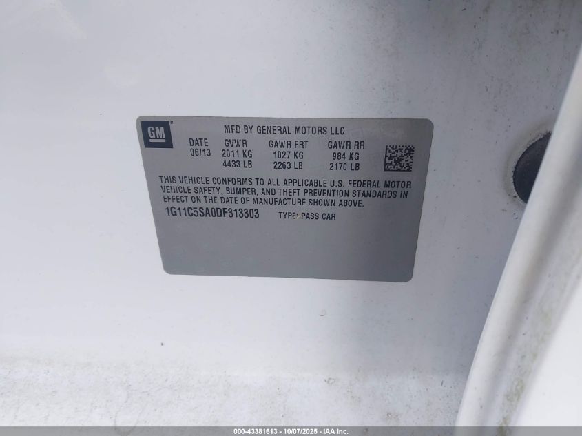 2013 CHEVROLET MALIBU 1LT VIN: 1G11C5SA0DF313303 LOT: 43381613