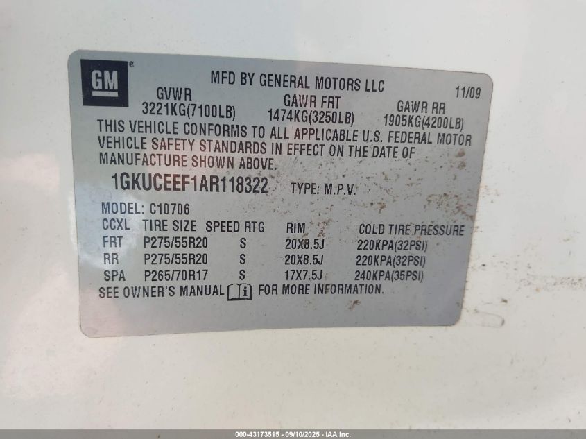 2010 GMC YUKON DENALI VIN: 1GKUCEEF1AR118322 LOT: 43173515