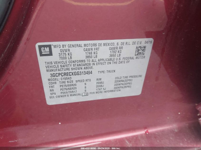 2016 CHEVROLET SILVERADO 1500 1LT VIN: 3GCPCRECXGG313494 LOT: 43310056