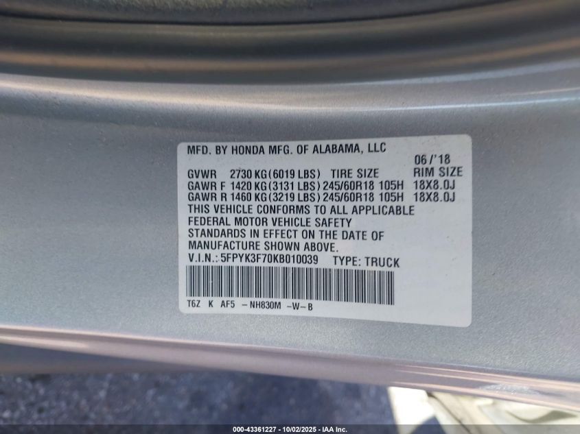 2019 HONDA RIDGELINE RTL-E VIN: 5FPYK3F70KB010039 LOT: 43361227