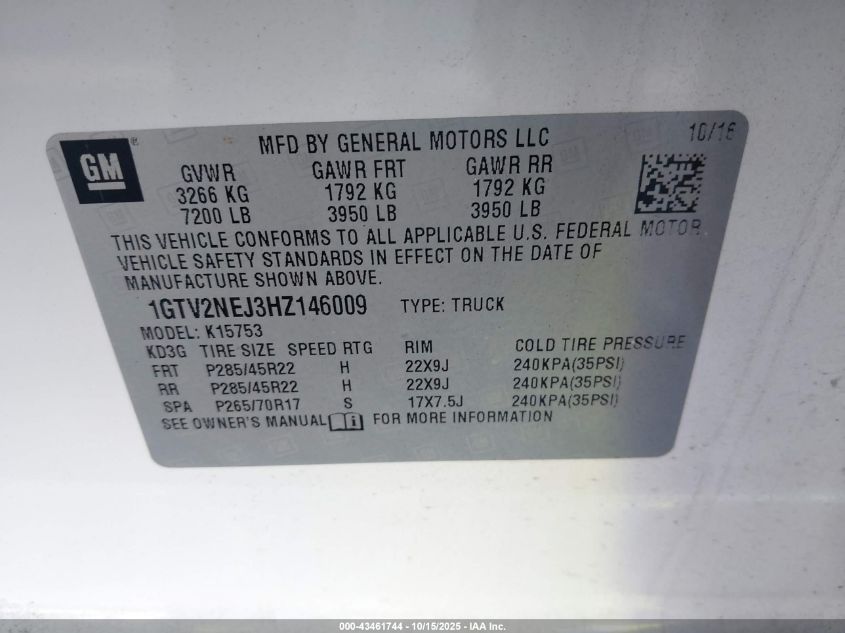 2017 GMC SIERRA 1500 SLT VIN: 1GTV2NEJ3HZ146009 LOT: 43461744