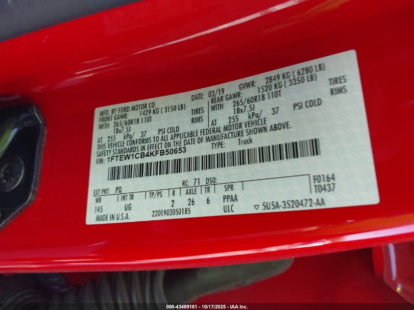 2019 FORD F-150 XLT VIN: 1FTEW1CB4KFB50653 LOT: 43469161