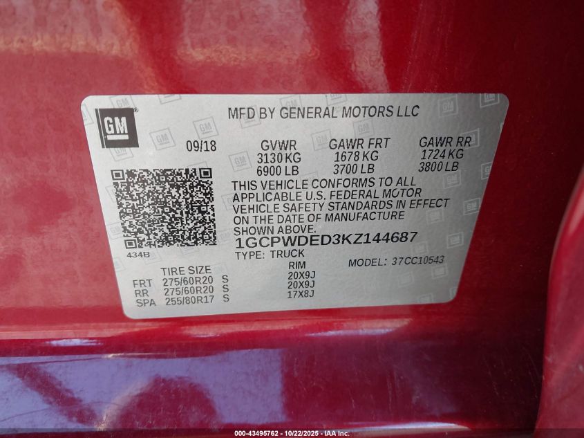 2019 CHEVROLET SILVERADO 1500 RST VIN: 1GCPWDED3KZ144687 LOT: 43495762